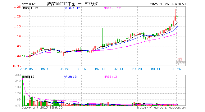 沪深300ETF中金(510320)业绩比较基准为沪深300指数收益率,管理人为中金基金管理有限公司,基金经理为刘重晋,成立(2025-04-16)以来回报为19.84%,近一个月回报为8.37%。